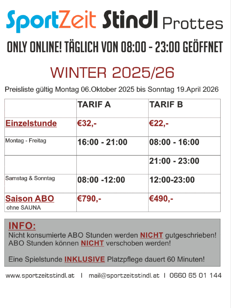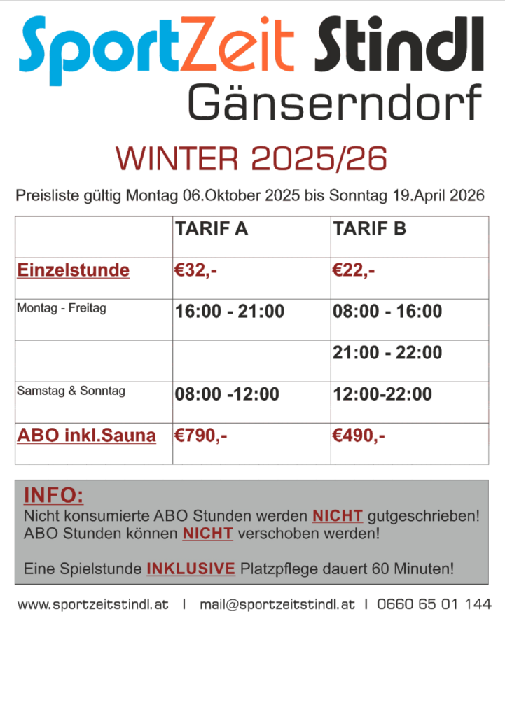 11. Oktober 2024 Stindl Preisliste TENNIS Wintersaison 2025/2026 Tarif A Tarif B Einzelstunde € 32,– € 22,– Montag bis Freitag 16:00 – 21:00 08:00 – 16:00 21:00 – 22:00 Samstag & Sonntag 08:00 – 12:00 12:00 – 22:00 Saison-Abo € 790,– € 490,–